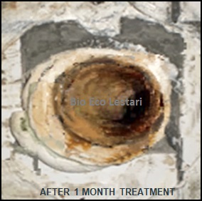 Setelah treatment 3 minggu rutin dengan metode spray di dinding urinal dengan produk Biobugs Liquid Concentrate, didapati kotoran organic keras tersebut telah terurai dan problem yang dikeluhkan seperti lambatnya air turun bersamaan dengan terurainya menjadi hilang. Bau tidak sedap (pesing) pun hilang.
